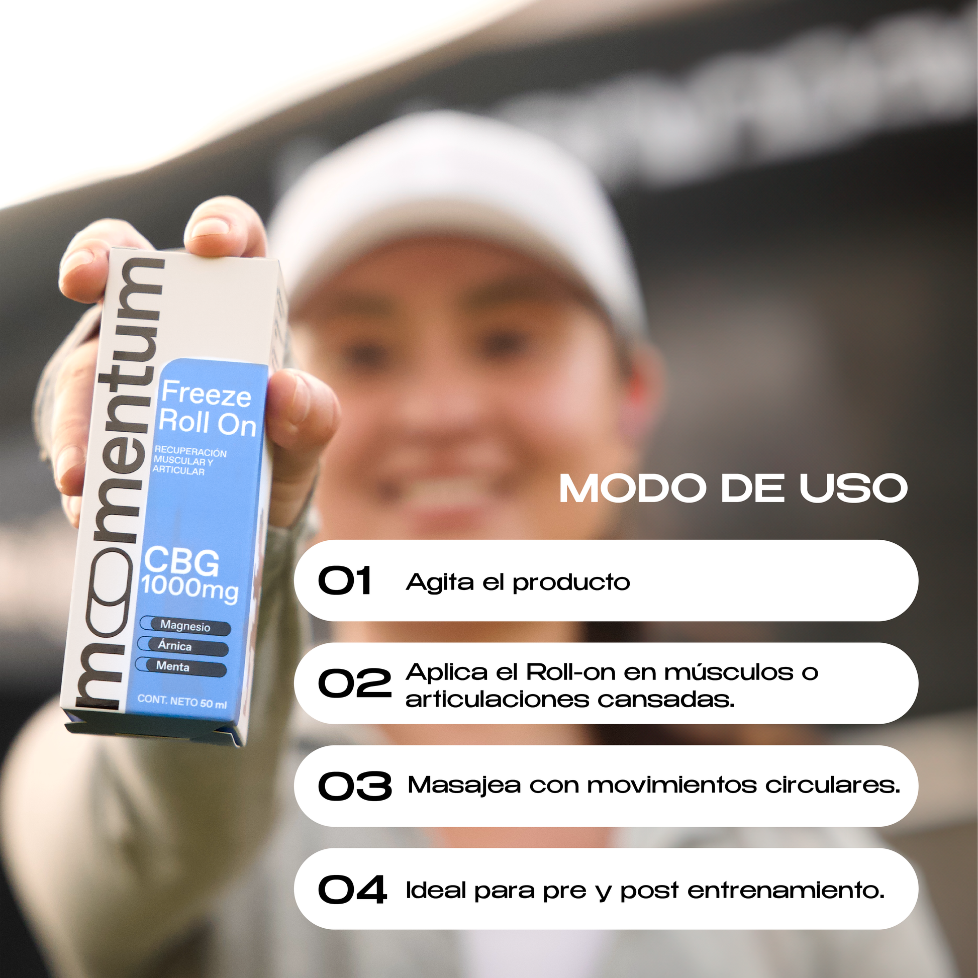 Coloca el roll-on en el área deseada y comienza la aplicación sobre piel limpia y seca.